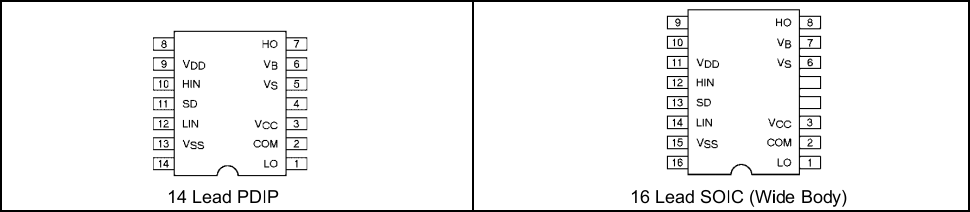 Также стоит упомянуть, что IR2110 выпускается в двух корпусах — в виде 14-контактного PDIP для выводного монтажа и 16-контактного SOIC для поверхностного монтажа.