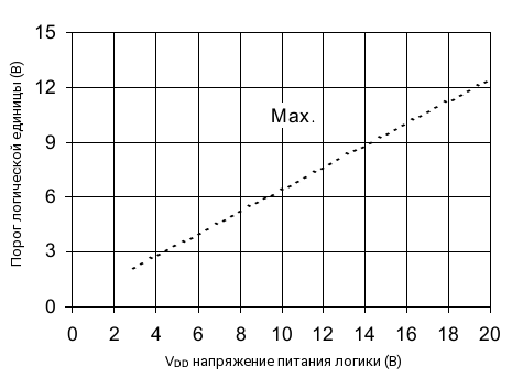 VCC — это питание нижнего уровня, должно быть между 10В и 20В. VDD — это логическое питание для IR2110, оно должно быть между +3В и +20В (по отношению к VSS). Фактическое напряжение, которое вы выберете для использования, зависит от уровня напряжения входных сигналов. Вот график: